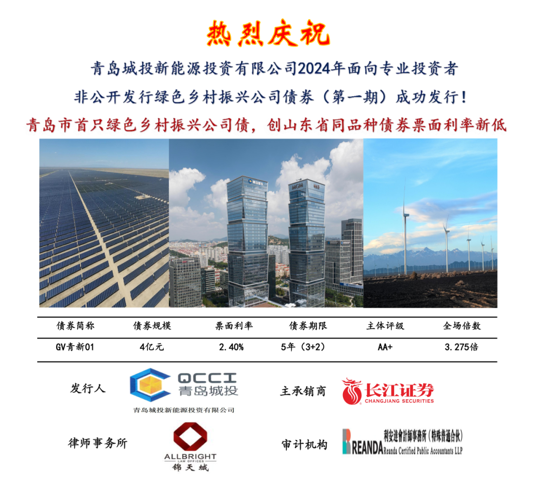 7月19日,青岛半岛线上官网_半岛online(中国)体育新能源集团成功以自身主体评级AA+、无担保方式发行公司债券(GV青新01)。本期债券发行规模4亿元,为青岛市首只绿色乡村振兴公司债券,发行期限3+2年。本期债券发行共吸引了24家投资机构,全场认购倍数达3.275倍,票面利率2.4%,创山东省同品种债券利率新低。