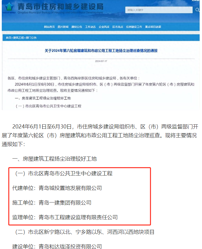 近日,青岛半岛线上官网_半岛online(中国)体育集团旗下城市更新集团公共卫生中心项目积极响应市住建局号召,做好项目扬尘治理,并在青岛市住建局2024年第六轮房屋建筑和公用工程工地扬尘治理检查中获通报表扬。