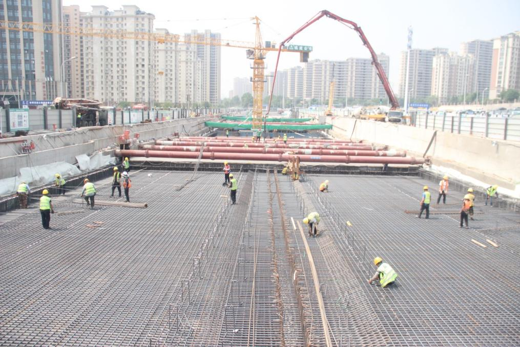 自2023年10月黑龙江地道地道围护结构施工以来,唐山路快速路工程团队科学调配资源、优化施工组织,接连攻坚完成220KV电力管廊施工、调流路完工通车、主体底板浇筑等节点工程,并于今年6月提前实现主体结构封顶。三伏高温天气恰逢地道建设攻坚阶段,项目在做好防暑降温、安全生产管理的同时,集中力量进行饱和式投入。施工高峰期,现场作业人员超过300名,累计投入挖掘机、吊车、运输车、摊铺机、压路机等机械设备超过120台,确保项目高质量、按期推进。