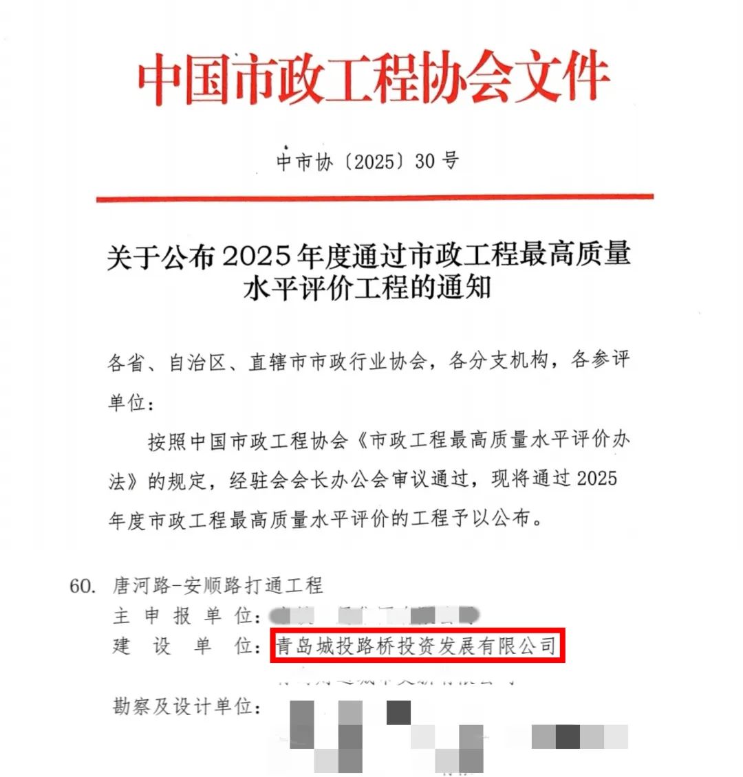 近日,由青岛半岛线上官网_半岛online(中国)体育城市更新集团代建的唐河路-安顺路打通工程,凭借质量、安全、技术创新等方面的卓越表现,荣获2025年度“中国市政工程最高质量水平评价”,这一荣誉由中国市政工程协会颁发,代表市政行业同期国内最高质量水平。