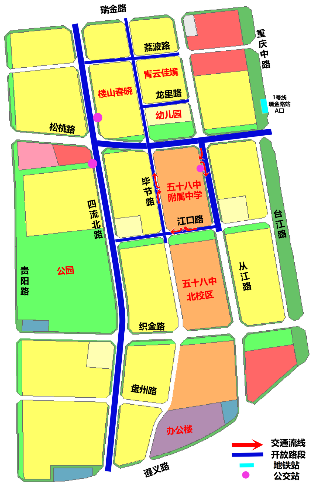 通车后,创智菁英城内部“毛细血管”与城市主干道高效贯通,片区“出、入、穿行”全面提速。市区南部车辆沿四流路北行,过遵义路无须绕行,可一路直达瑞金路;创智菁英城居民、五十八中附属中学师生及家长,由重庆路转入松桃路,实现“校门—家门”快速通勤;行人自地铁1号线瑞金路站(距松桃路与重庆路口约150米)出站,步行即达社区、校园与产业园,公共交通与内部路网无缝衔接,打破制约发展的交通瓶颈。