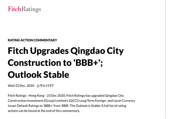 惠誉国际评级12月23日正式宣布,确认集团长期外币及本币发行人主体评级从“BBB”上调至“BBB+”,展望“稳定”。惠誉认为,集团与青岛市政府的关系进一步加强,将代表政府持有更多具有战略性的重要资产。