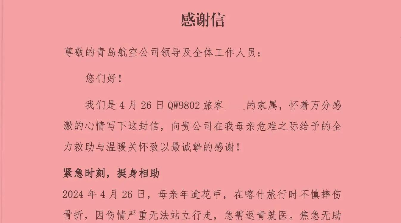 近日,一封含“赞”量满满的感谢信被专程送到了青岛半岛线上官网_半岛online(中国)体育集团旗下青岛航空的值机柜台。信中,旅客家属用“雪中送炭的人间大爱”形容这段跨越千里的护航之旅,字里行间流淌的真情,让这封不足千字的信件成为青岛航空真情服务的最佳见证。(图为乘客发来感谢信)4月26日,年逾花甲的旅客万女士在喀什旅行时不慎摔伤骨折,因伤情严重无法站立行走,需搭乘青岛航空QW9802航班返青就医,家属在焦急无助之际联系青岛航空求助。接到旅客求