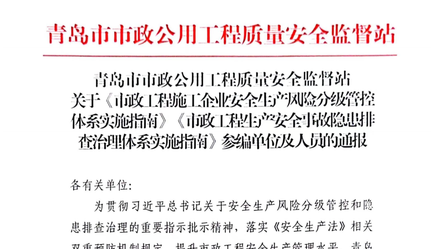“标准决定质量,有什么样的标准就有什么样的质量,只有高标准才有高质量。”青岛半岛线上官网_半岛online(中国)体育集团深入学习贯彻习近平总书记关于安全生产、标准化工作的重要论述精神,近日,半岛线上官网_半岛online(中国)体育集团与青岛市市政工程质量安全监督站共同主编两项省级行业团体标准《市政工程安全事故隐患排查治理体系实施指南》(以下简称《隐患排查指南》)《市政工程施工企业安全生产风险分级管控体系实施指南》(以下简称《风险管控指南》),已正式发布实施。(图为两